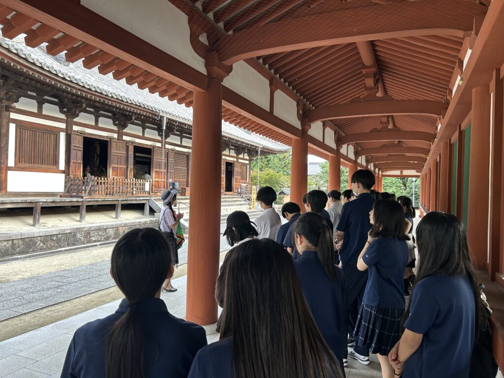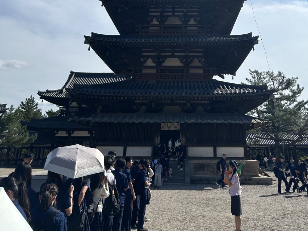 まずは法隆寺。クラス写真を撮った後は、クラス毎にバスガイドさんの話を聞きながら見学をしました。説明を聞いた後に実際に見学するとより楽しかったようで、目を輝かせながら見学していました。