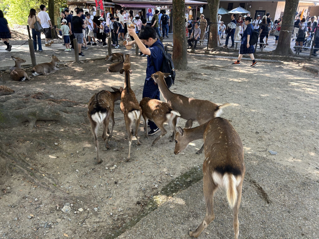 春日大社、二月堂、大仏殿、南大門、興福寺国宝館へと周りましたが、1番盛り上がっていたのはやはり野生鹿との触れ合いでした。