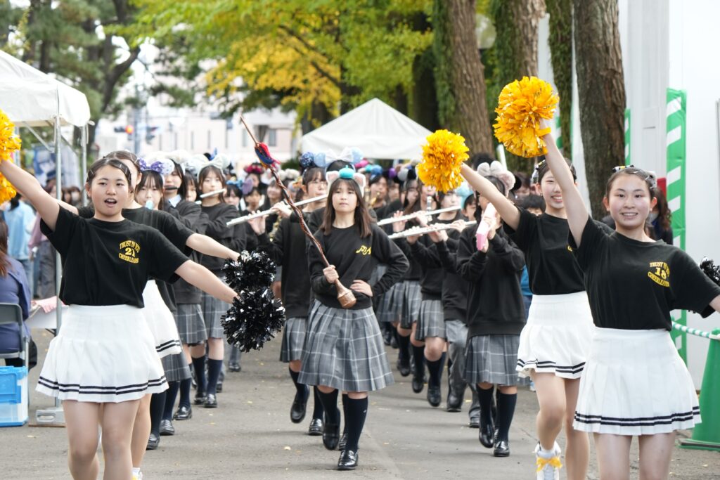 また、部活ステージも魅力的なものが盛りだくさんでした。正午頃には、正門から雪頂講堂までの並木道をブラスバンド部と今年度が最後の活動となるチアダンス部がコラボレーションしてパレードを行い、大いに盛り上がりました。