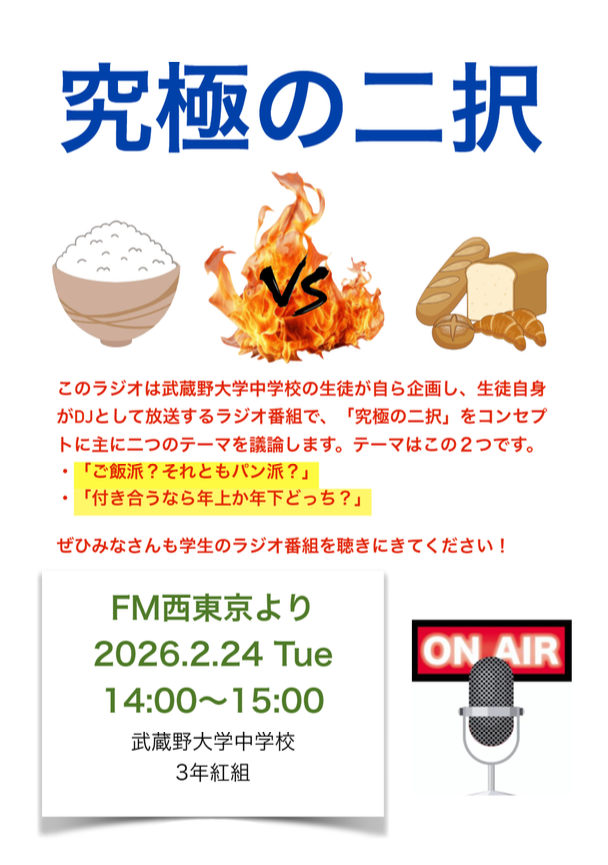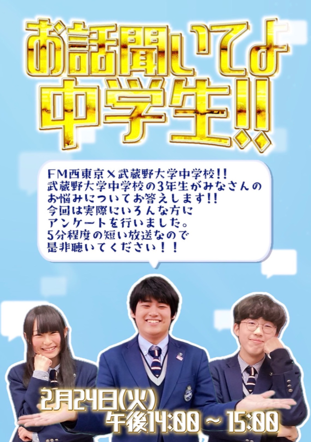 2月24日(火)14:00~15:00、「FM西東京」にて本校の中学3年生によるオリジナル番組が放送されることとなりました。