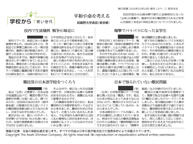 2026年3月24日(火)「朝日新聞」の朝刊内「平和や命を考える」にて本校の高校1年生「公共」での取り組みが紹介されました。