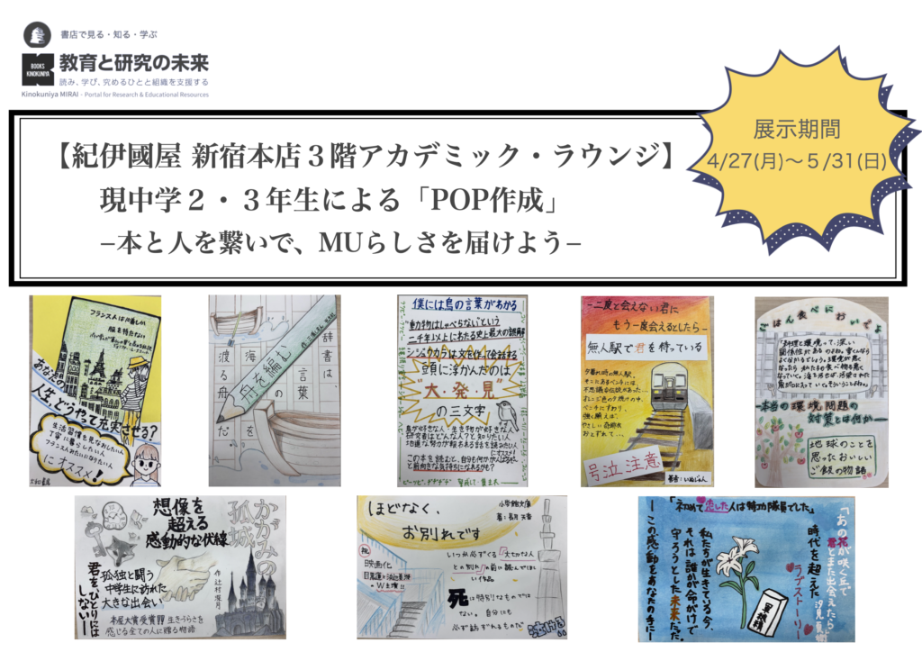 紀伊國屋新宿本店3階、アカデミックラウンジ内にて本校の中学2・3年生による「POP作成」が展示されております。